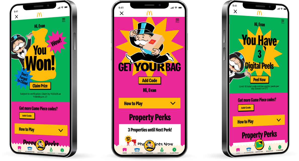 The game included its standard physical peel with a digital twist; the collecting of property pieces, redemption of prizes and additional “Bonus Play” was now housed within the McDonald’s app. Plus, purchasing select items through the app offered a digital version of the tactile peel.